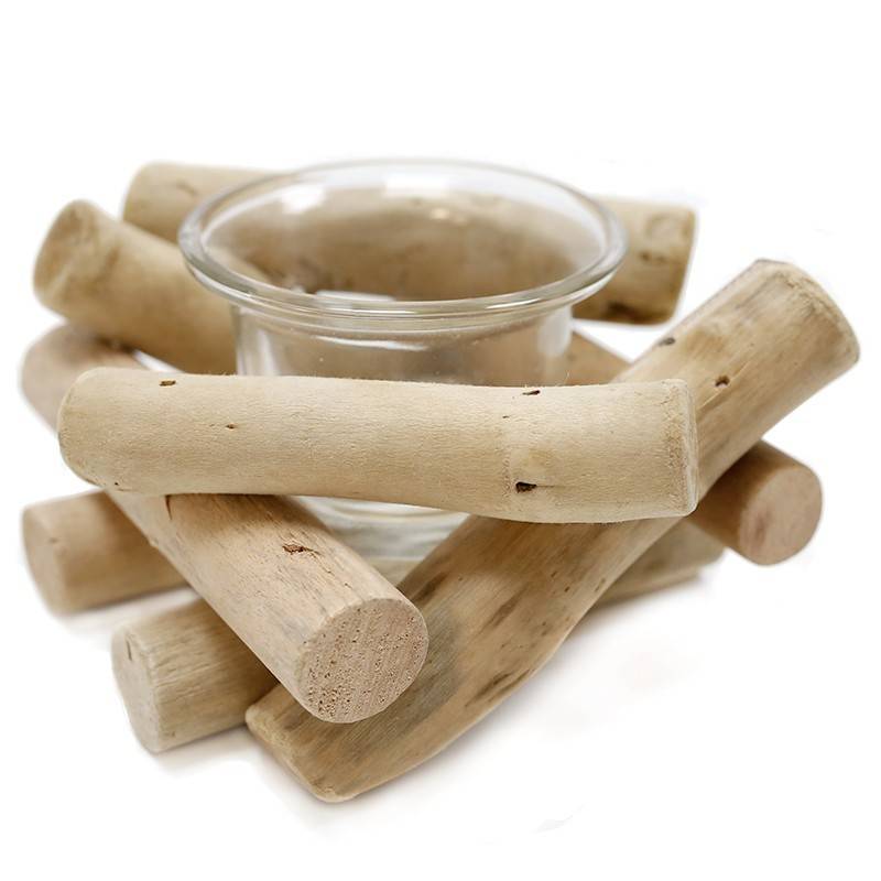 PORTA VELAS FABRICADO CON MADERA DE MAR.INCLUYE VASO CRISTAL PARA VELAS DE TÉ. DISEÑO RÚSTICO.
