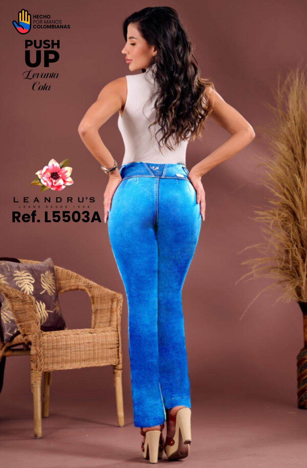 JEANS LEANDRUS L5503A Confeccionado en denim licrado de color azul medio con efecto desgastado, este jean bota recta te permite lucir estilizada sin sacrificar comodidad. El ajuste en la cintura ofrece soporte adicional en el abdomen y la confección colombiana garantiza calidad en cada costura. Características destacadas: