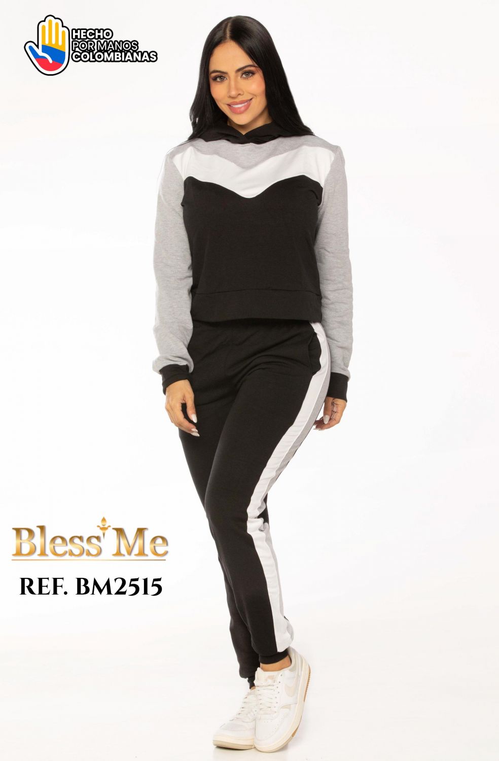 CONJUNTO DEPORTIVO BLESS ME REF BM2515 El Conjunto Deportivo Ref. BM2515 de Bless Me es la combinación ideal de confort y diseño para acompañarte en tu día a día. Su tejido suave y elástico se adapta a tu figura, brindando libertad de movimiento y una sensación ligera en cada paso. El diseño bicolor en negro, gris y blanco aporta un contraste moderno que estiliza la silueta, mientras que su capucha ajustable y el corte ceñido en cintura y tobillos añaden un toque funcional y actual. Perfecto para quienes buscan un look versátil que pueda usarse tanto para entrenar como para disfrutar de un día casual. Características destacadas: