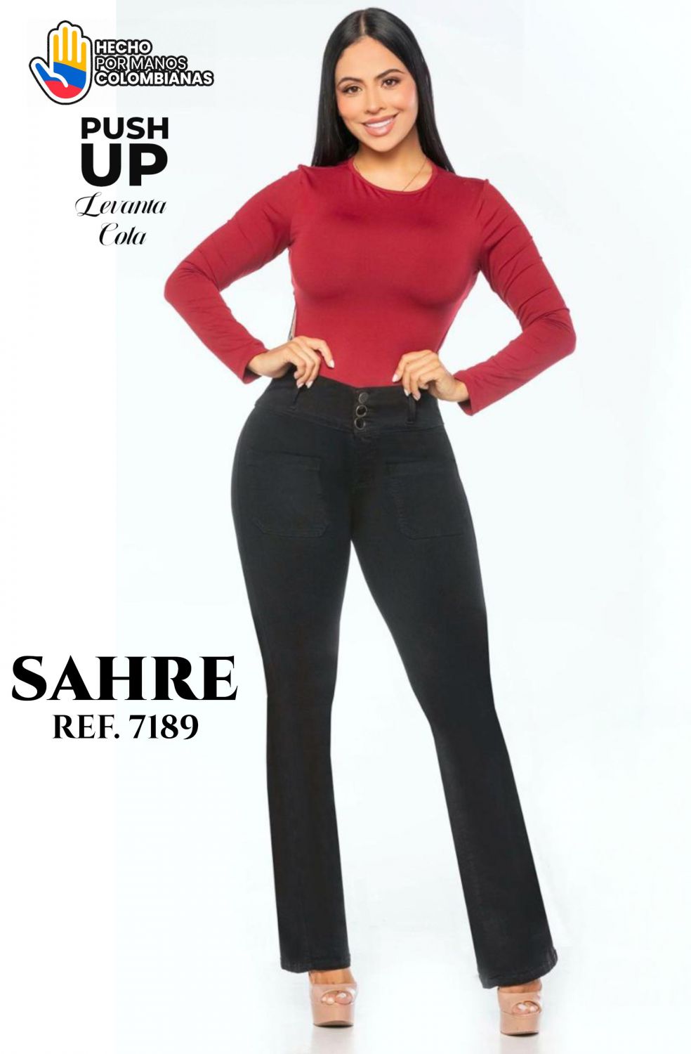 JEANS COLOMBIANO REF SH7189 Jean Colombiano Ref. 7189 – Control abdomen y realce naturalEl Jean Colombiano Ref. 7189 de Sahre combina el poder del realce con la elegancia del diseño colombiano. Su confección de tiro alto con pretina anatómica de tres botones y tejido elástico premium moldea la figura y estiliza la cintura sin perder comodidad. El diseño con efecto push up levanta los glúteos de manera natural, resaltando la silueta femenina. Su bota semi campana y tono oscuro aportan un toque sofisticado que se adapta a cualquier ocasión, desde el día a día hasta salidas especiales. Características destacadas: