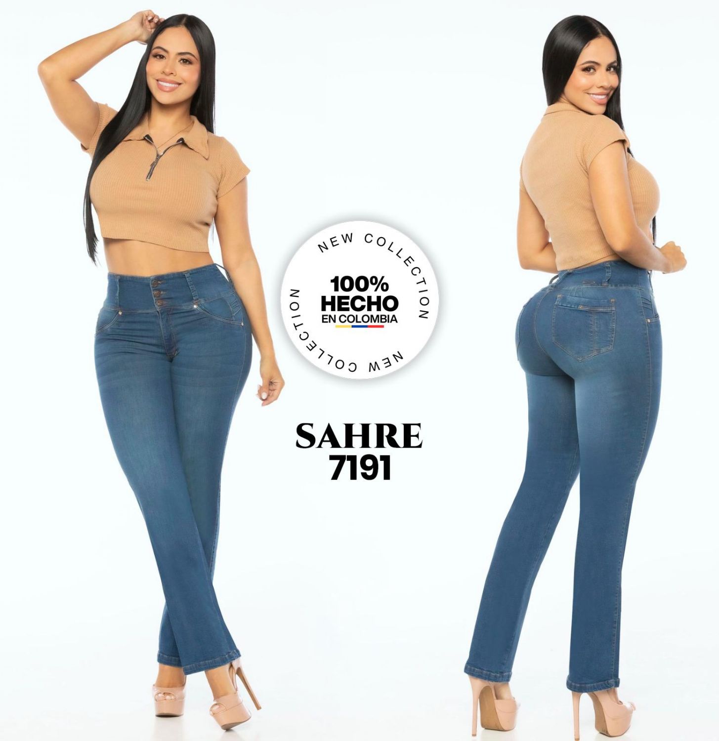 JEANS COLOMBIANO REF SH7191 Jean Levantacola Sahre Ref. 7191 – Moldea, realza y estiliza tu figuraEl jean colombiano Ref. 7191 de Sahre ofrece un ajuste perfecto que resalta las curvas naturales con estilo y comodidad. Su diseño de pretina alta con tres botones define la cintura y aporta un efecto moldeador en el abdomen, logrando una silueta más estilizada. Fabricado en denim elástico de alta calidad, este modelo combina suavidad, resistencia y un efecto push up que realza los glúteos con un acabado natural. Su corte clásico de bota recta lo hace ideal para todo tipo de cuerpo y ocasión. Características destacadas: