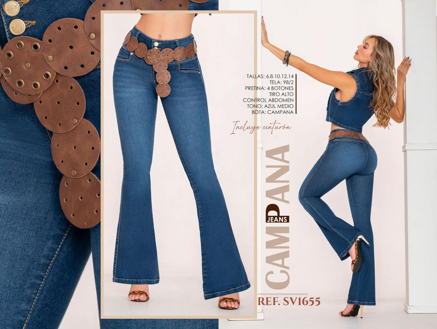 JEANS SEVEN7 REF SV1655 El Jean Colombiano SV1655 es la mezcla perfecta entre estilo clásico y esencia artesanal. Confeccionado en tela denim elástica 98/2, ofrece una estructura firme pero cómoda que realza tu figura con un ajuste natural. Su pretina alta de 4 botones moldea el abdomen y estiliza la cintura, mientras que la bota campana alarga visualmente las piernas aportando un toque elegante y retro. Incluye un cinturón decorativo en cuero sintético tipo artesanal, que complementa el diseño con un detalle distintivo y versátil. Características destacadas: