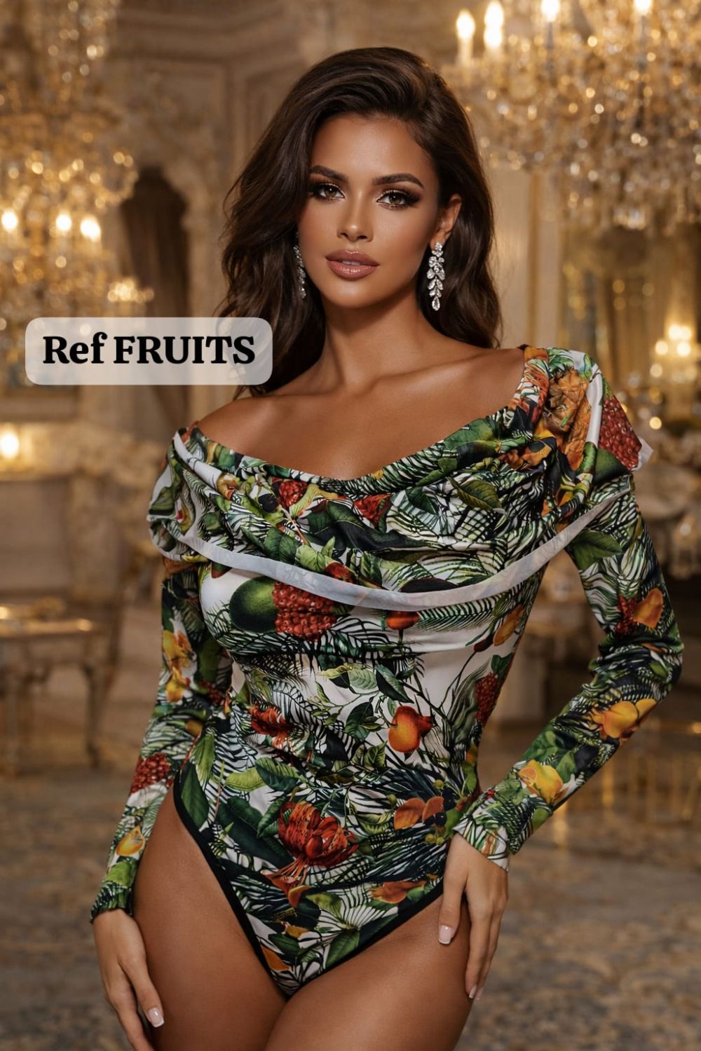 Body femenino y sofisticado con un elegante escote bardot que deja los hombros al descubierto, aportando un toque sensual y refinado. Su diseño estampado de inspiración tropical aporta frescura y personalidad, convirtiéndolo en una prenda protagonista.