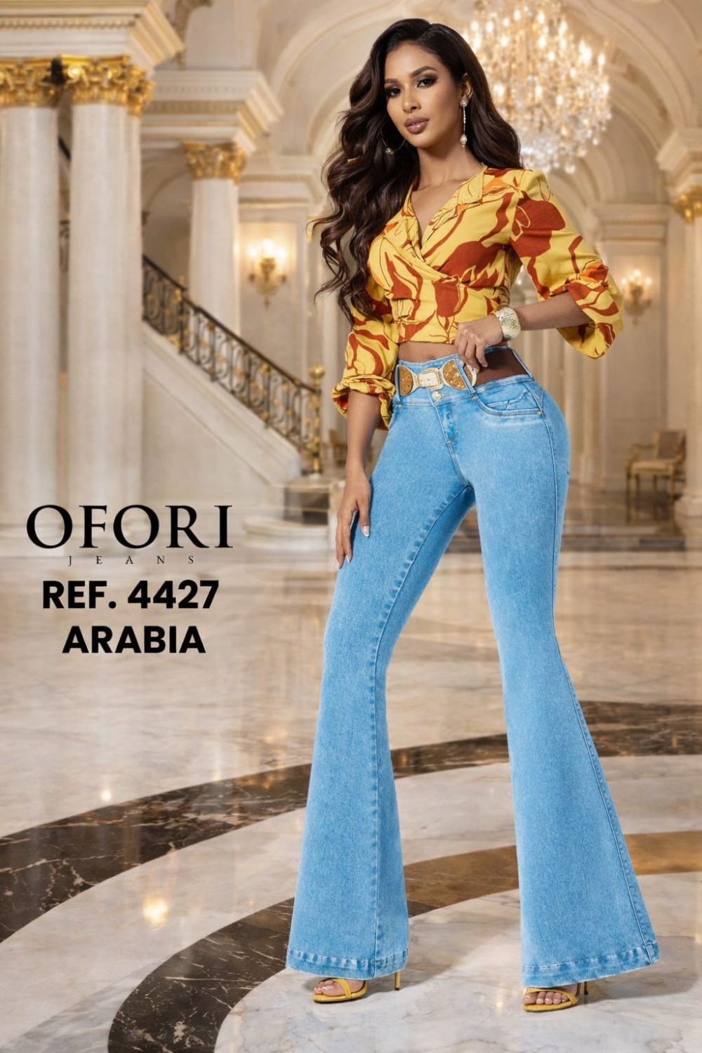 JEAN OFORI REF.4427ARABIA El Jean Colombiano Levantacola Ref. 4427 Arabia es una prenda diseñada para realzar la figura femenina con equilibrio, comodidad y estilo. Confeccionado bajo los estándares de la moda colombiana, este jean combina estructura, suavidad y un diseño favorecedor que estiliza desde la cintura hasta la bota. Su tela con efecto piel de durazno aporta un tacto suave y un acabado visual limpio, ideal para un look pulido y moderno. La pretina tiro alto con 3 botones define el abdomen y marca la cintura, proporcionando soporte y un ajuste firme que estiliza la silueta. El sistema levantacola realza los glúteos de forma natural, creando curvas armoniosas sin exagerar. La bota campana equilibra la figura y alarga visualmente las piernas, aportando un aire sofisticado y femenino, perfecto para looks elegantes o casuales bien definidos. Un jean pensado para mujeres que buscan presencia, comodidad y un ajuste que realmente se note. Características destacadas: