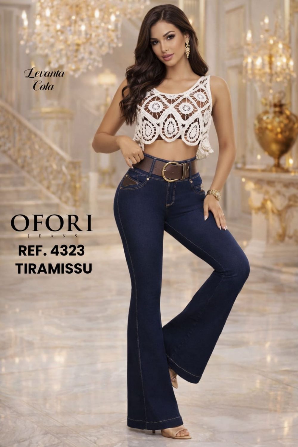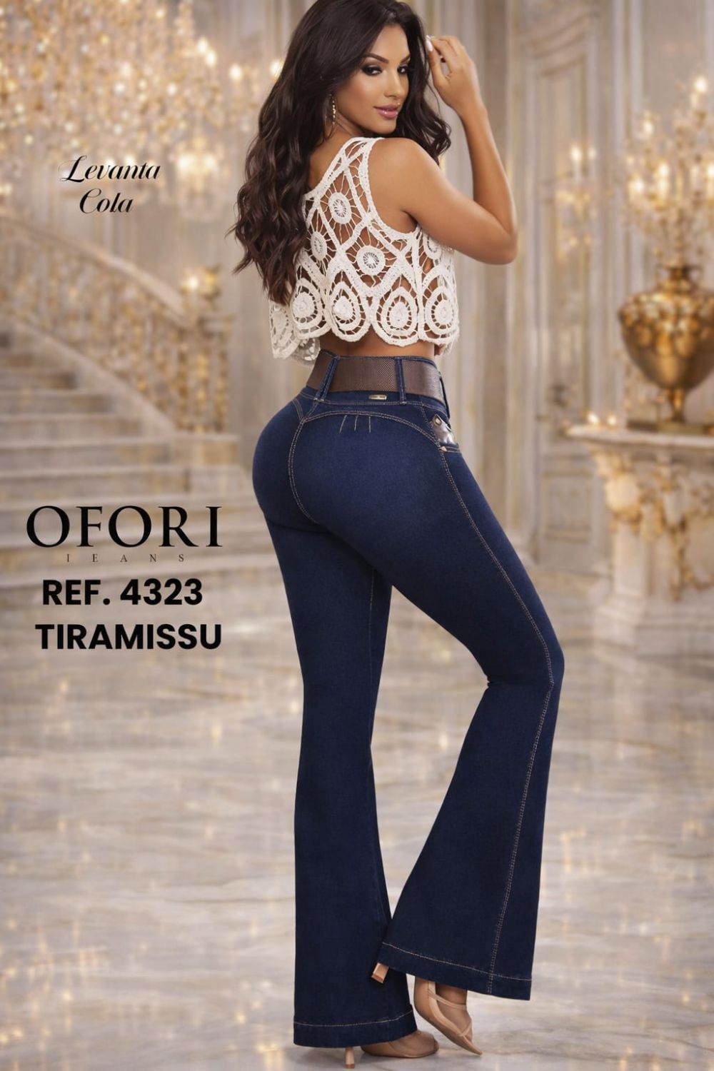 JEANS OFORI Ref. 4323 TIRAMISU El Jean Colombiano Levantacola Ref. 4323 Tiramissu es una prenda diseñada para resaltar la silueta femenina con precisión y estilo. Un jean que combina la tradición de la confección colombiana con un diseño moderno, favorecedor y pensado para realzar las curvas de forma natural. Su sistema levantacola moldea y proyecta los glúteos sin exagerar, logrando una figura armónica y estilizada. La pretina tiro alto define la cintura y aporta soporte en el abdomen, creando un ajuste firme y cómodo durante todo el día. El diseño incorpora bota campana, ideal para equilibrar la silueta y alargar visualmente las piernas, aportando un toque sofisticado y femenino. El tono azul oscuro y los acabados limpios hacen de este jean una pieza versátil, fácil de combinar y perfecta para distintos estilos. Un jean pensado para mujeres que buscan presencia, seguridad y un fit que realmente marque la diferencia. Características destacadas: