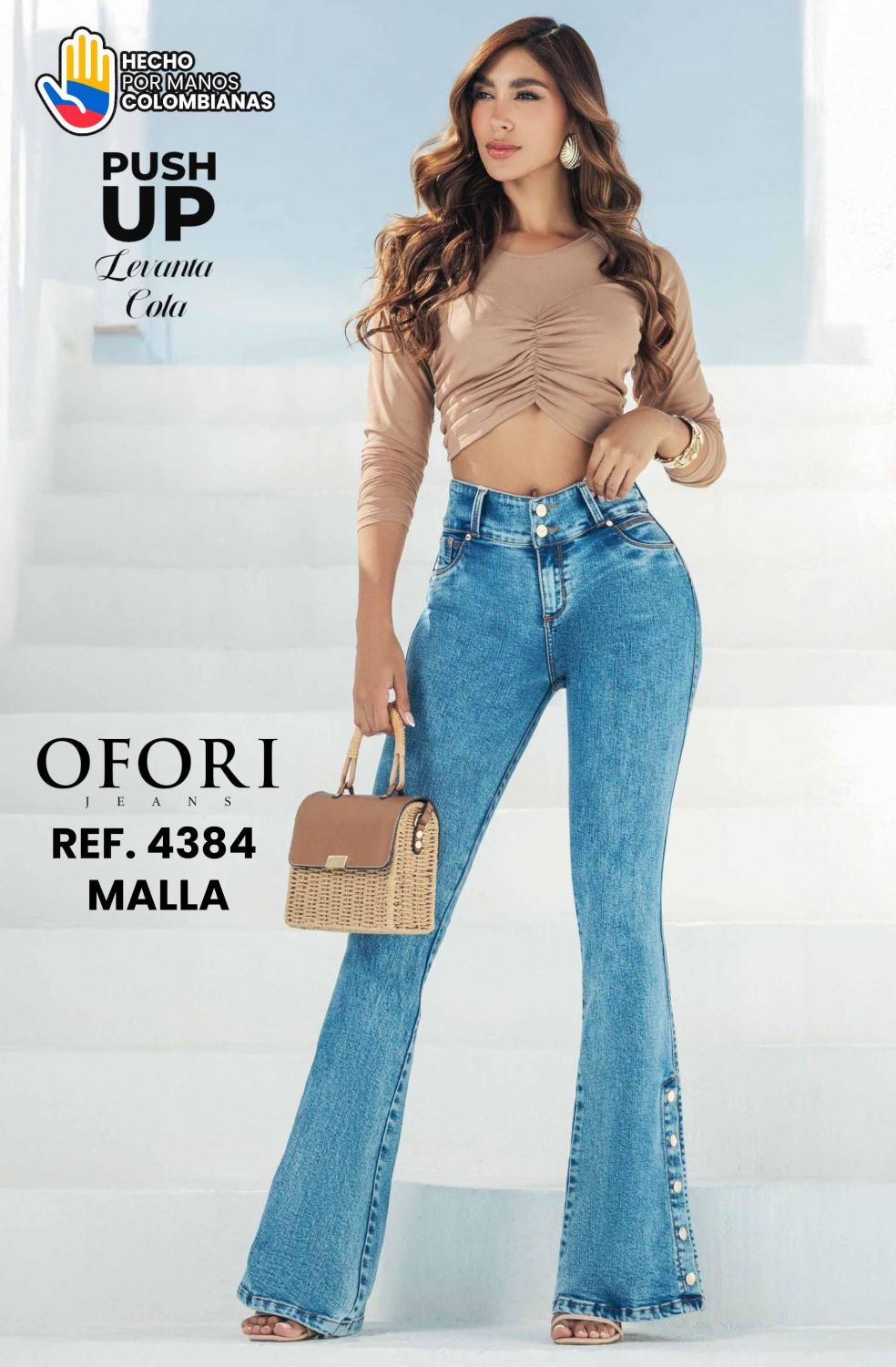 JEAN OFORI Ref. 4384 MALLA El Jean Colombiano Levantacola Ref. 4384 MALLA es una prenda diseñada para mujeres que buscan comodidad real sin renunciar a una silueta definida y femenina. Confeccionado en Colombia, este jean combina tecnología textil, elasticidad y diseño para ofrecer un calce que se adapta al cuerpo y realza las curvas de forma natural. Su tela tipo malla super stretch proporciona una sensación de ajuste tipo segunda piel, permitiendo libertad de movimiento y máximo confort durante todo el día. La pretina tiro alto con doble botón ayuda a definir la cintura y aporta soporte en la zona abdominal, estilizando visualmente la figura. El sistema levantacola, integrado de manera estratégica, realza los glúteos de forma armónica, logrando un efecto moldeador favorecedor sin rigidez. El corte bota campana equilibra las proporciones del cuerpo y alarga visualmente las piernas, mientras que los detalles de botones laterales en el bajo aportan un toque moderno y diferenciador. Un jean versátil, cómodo y elegante, fiel al sello del jean colombiano bien confeccionado. Características destacadas: