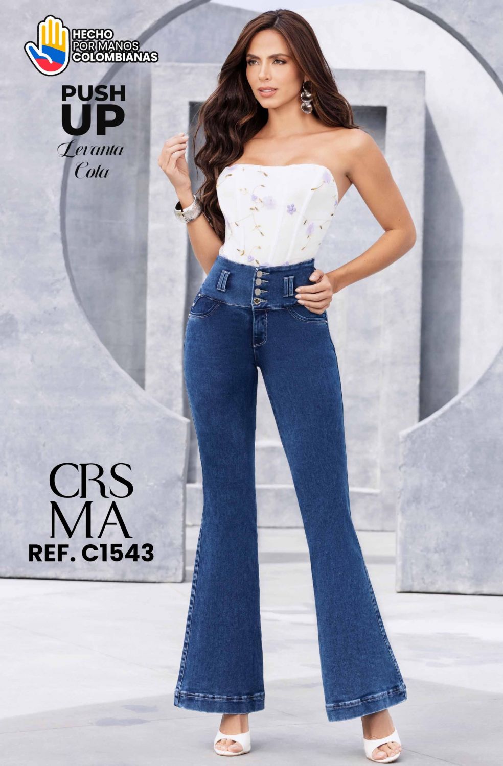 JEAN OFORI Ref. 1543 El Jean Colombiano Levantacola Ref. 1543 está diseñado para mujeres que buscan definición, porte y un ajuste impecable. Confeccionado en Colombia, este modelo combina ingeniería textil y diseño estratégico para lograr una silueta estilizada y poderosa. Su pretina tiro alto con cuatro botones aporta control en el abdomen y define la cintura con firmeza, mientras que el sistema push up con bolsillos realza los glúteos de forma natural, creando un efecto levantacola visible y equilibrado. La silueta bota campana (flare) alarga visualmente las piernas y aporta elegancia al conjunto. La tela efecto piel de durazno satinada, con tecnología ultra stretch, se adapta al cuerpo sin perder estructura, ofreciendo comodidad y un acabado sofisticado. El tono azul medio con detalles de pedrería en bolsillos traseros añade un toque femenino y refinado sin exagerar. Un jean pensado para destacar con clase, ideal para ocasiones donde el look debe hablar por sí solo. Características destacadas: