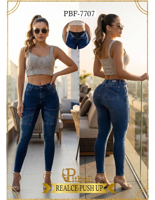 JEANS PITBULL REF PBF7707 Luce una silueta espectacular con el nuevo Pantalón Pitbull PBF-7707, diseñado específicamente para realzar tus curvas de forma natural y sofisticada. Este modelo integra una faja interna ajustable que comprime el abdomen medio y bajo, brindándote un control total y una cintura más definida. Su exclusivo sistema levanta cola (Push Up) es el aliado perfecto para resaltar tu figura con la comodidad que solo la auténtica mezclilla colombiana puede ofrecer. Productos en la misma categoría