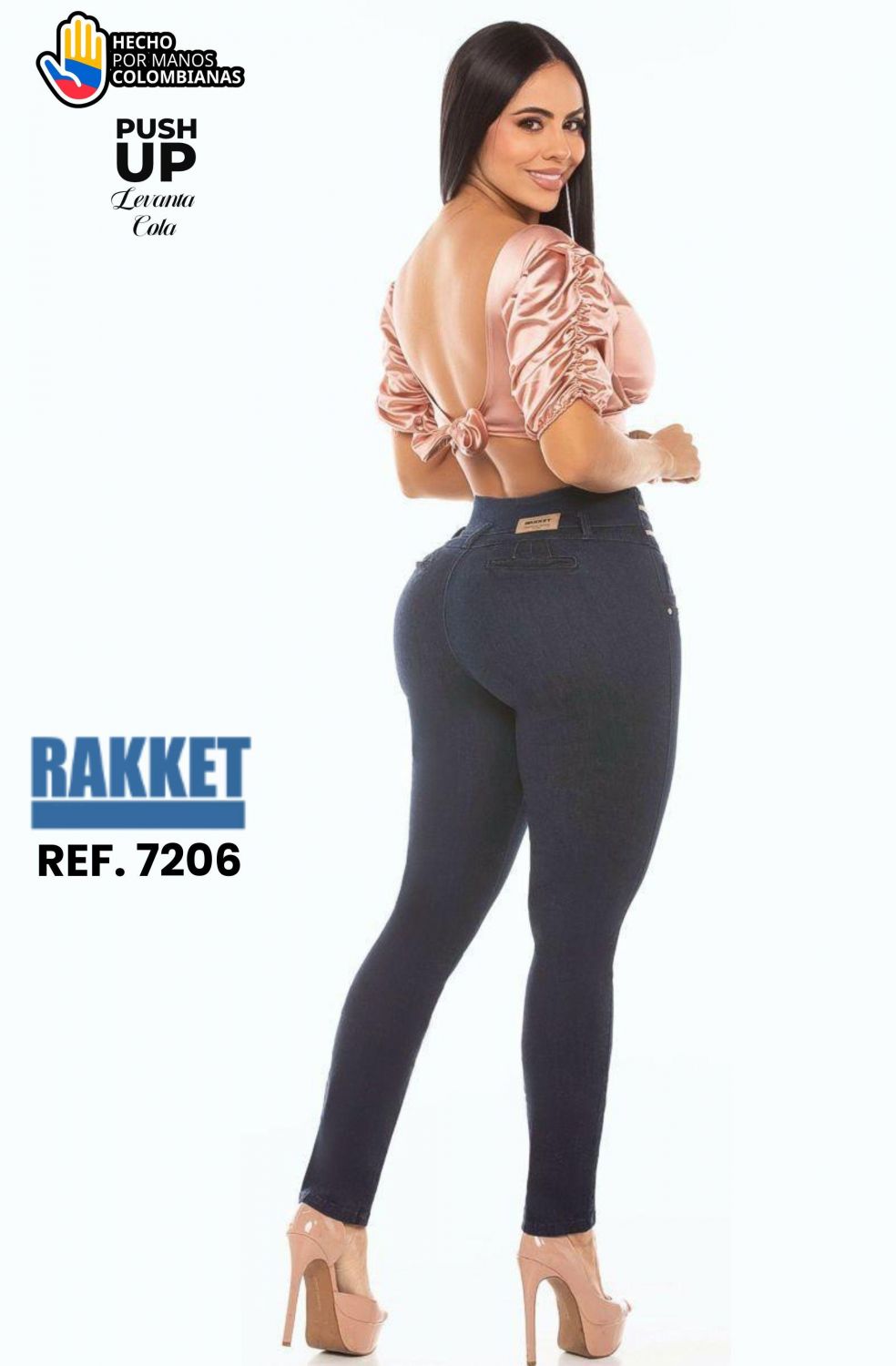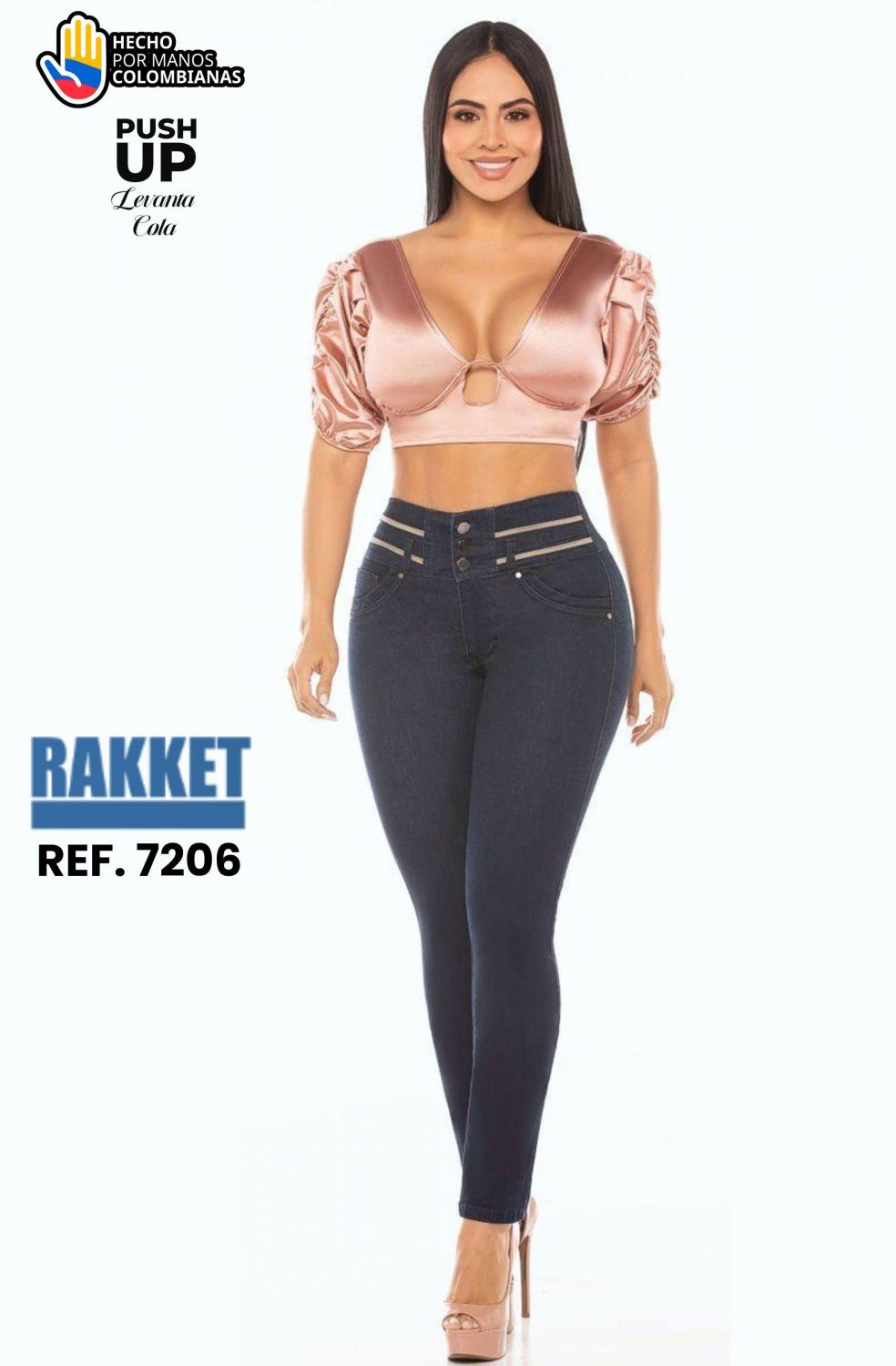 JEANS RAKKET REF 7206 Jean Colombiano Levantacola Ref. 7206 – Skinny Push Up Tiro Alto El Jean Colombiano Levantacola Ref. 7206 está diseñado para realzar tu figura con un ajuste firme, elegante y altamente favorecedor. Su silueta skinny se adapta al cuerpo marcando la cintura y estilizando las piernas con un acabado sofisticado. Confeccionado en denim elástico de alta calidad, ofrece comodidad, ajuste perfecto y excelente recuperación. Su tono azul oscuro aporta un estilo más refinado, ideal para looks casuales, de oficina o combinaciones más elegantes de noche. Incorpora pretina de tiro alto con triple botón, que ayuda a moldear el abdomen y definir la cintura. Su diseño incluye detalles decorativos en la pretina que aportan un toque moderno y diferencial. El sistema push up levantacola con bolsillos traseros estratégicamente diseñados genera un realce natural que armoniza la silueta. Un jean pensado para mujeres que buscan seguridad, estructura y curvas bien definidas. Características destacadas: • Jean colombiano levantacola. Perfecto para quienes desean un jean levantacola colombiano tiro alto, con diseño sofisticado, ajuste firme y un efecto visual que transforma la figura desde el primer momento. Productos en la misma categoría