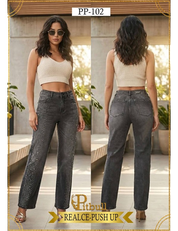 PANTALON PITBULL REF PP102 Pantalón colombiano con efecto realce push up y corte moderno que moldea la silueta. Fabricado en denim elástico de alta calidad con detalles brillantes decorativos que aportan un estilo elegante y sofisticado. Productos en la misma categoría