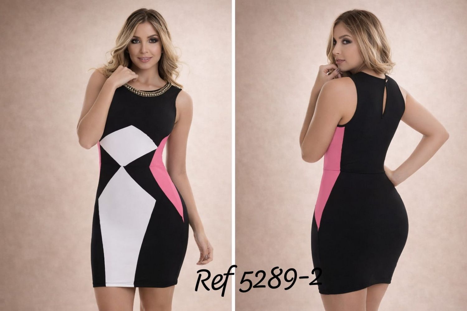 VESTIDO 100% HECHO EN COLOMBIA TALLA UNICA AJUSTABLE A TODAS LAS TALLAS Es un vestido corto y ceñido, de estilo elegante y moderno, pensado para resaltar la silueta. Diseño y colores Color base negro. En la parte frontal tiene un diseño geométrico muy llamativo: Un panel central blanco que alarga visualmente la figura. Detalles laterales en rosa fucsia, colocados de forma estratégica para marcar la cintura y crear un efecto “reloj de arena”El contraste negro–blanco–fucsia le da un aire sofisticado y muy fashion, ideal para catálogo o revista. Escote y parte superior Escote redondo y cerrado, elegante. El cuello está decorado con una aplicación tipo pedrería o bordado metálico, que aporta un toque luxury y hace que no necesite collar. Sin mangas, dejando los hombros descubiertos.Corte y largo Corte entallado, ajustado al cuerpo. Largo por encima de la rodilla, tipo mini dress elegante, no excesivamente corto.Estilo general Perfecto para eventos de noche, cócteles, cenas elegantes o para una revista de moda. Transmite una imagen sexy pero refinada, moderna y muy comercial. Ideal para marcas que quieren resaltar figura, diseño y elegancia sin ser vulgar. Productos en la misma categoría