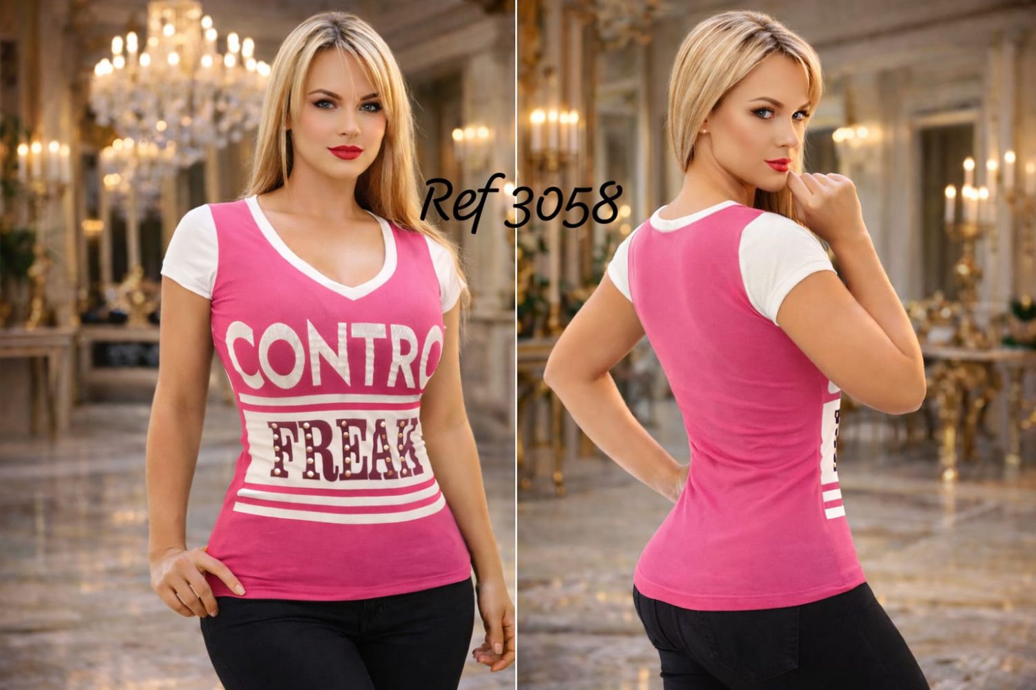 BLUSA ELABORADA EN ALGODÓN, CON DETALLE ESTAMPADO Y DETALLE EN PEDRERÍA DORADA. 100% COLOMBIANA.
