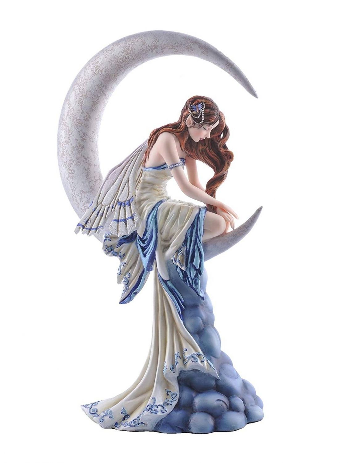 ESTA HADA SE PODA EN LA CURVA UNA LUNA CRECIENTE, EN PENSAMIENTOS PROFUNDOS Y RECUERDOS CARIÑOSOS. CON EL PELO CASTAÑO ROJIZO Y UN VESTIDO DE CREMA E ÍNDIGO, Y ALAS DE MARIPOSA.
