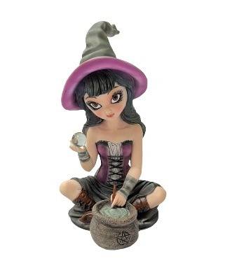BRUJA CON CALDERO DE POCIÓN MÁGICA.FIGURA DE RESINA PINTADA A MANO.MEDIDAS 15CM APROX.