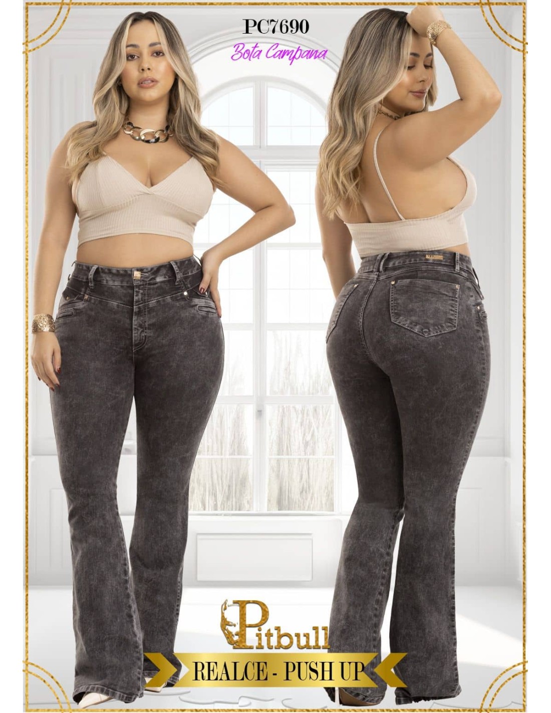 JEANS BOTA CAMPANA PITBULL REF PC7690 Este pantalón bota campana de Pitbull realza tu figura con un diseño cómodo y moderno. Ideal para looks casuales y elegantes. ¡Te sentirás increíble! Efecto push up y ajuste curvy. Realza glúteos, define cintura y estiliza piernas con una silueta visualmente más alargada. Productos en la misma categoría
