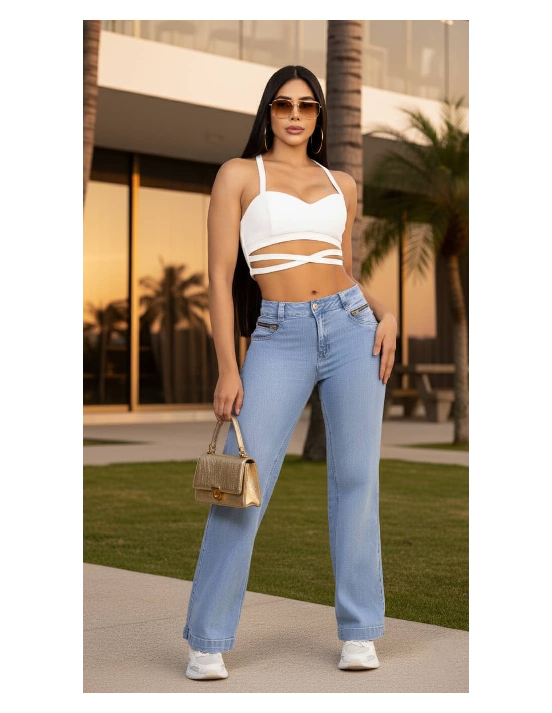 JEANS BOTA RECTA PITBULL REF PC7699 Pantalón colombiano en denim azul claro con corte bota ancha y detalles metálicos decorativos. Estilo cómodo, moderno y con realce natural de glúteos. Productos en la misma categoría