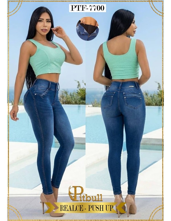 Jean colombiano azul intenso con faja interna, pretina alta con triple botón dorado y efecto push up.