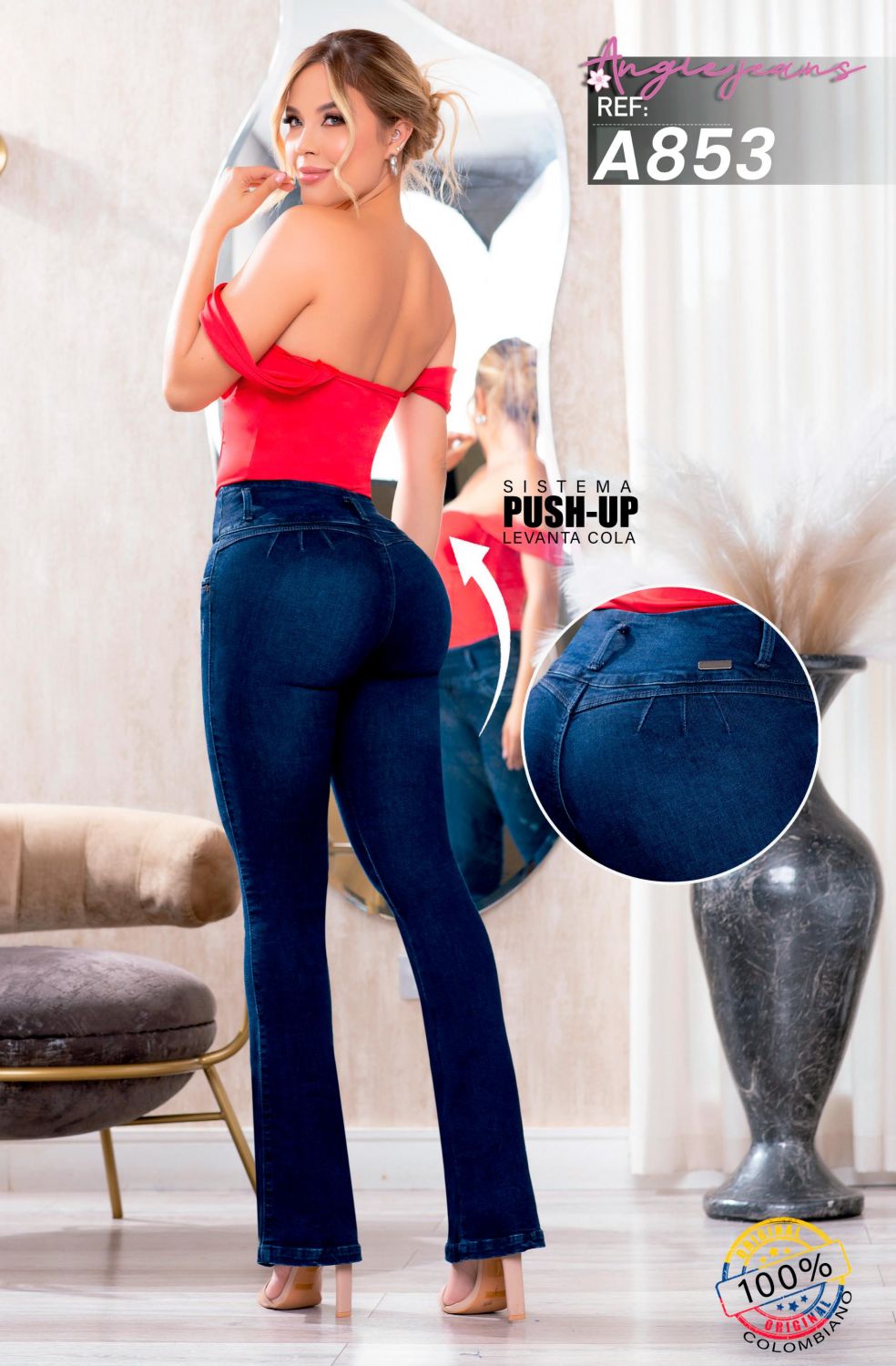 ANGIE JEANS REF A853 Este jean con tiro alto y control abdomen combina un diseño elegante con un ajuste que realza tu figura al instante. Su sistema push-up levanta cola ofrece un efecto moldeador natural, ideal para quienes desean una silueta más estilizada y femenina sin sacrificar comodidad. La bota campana añade un toque moderno y sofisticado, mientras que sus tres botones frontales aportan seguridad y soporte al área abdominal. Fabricado en jean licrado de alta calidad, este modelo se adapta con suavidad a tu cuerpo y te permite moverte con total libertad. Características destacadas: