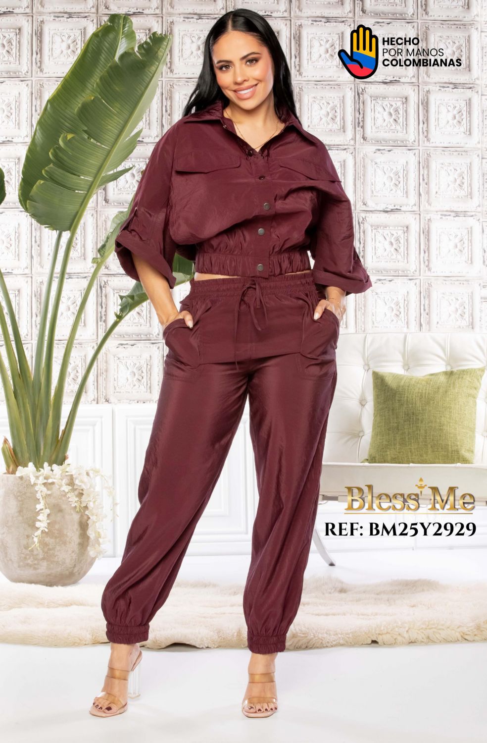 CONJUNTO BLESS ME REF BM25Y2929 Este conjunto burdeos combina una silueta relajada con detalles que realzan tu estilo. La chaqueta corta con botones frontales y manga 3/4 añade un toque moderno y favorecedor, mientras que el pantalón con cintura ajustable abraza tu figura con suavidad. Ideal para crear un look casual pero con presencia, sin esfuerzo. • Tejido liviano con caída natural Productos en la misma categoría