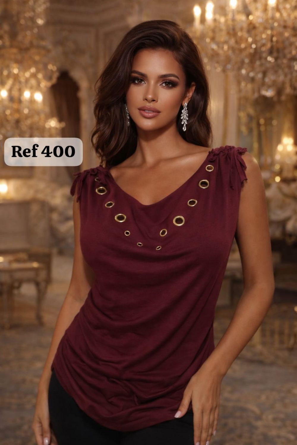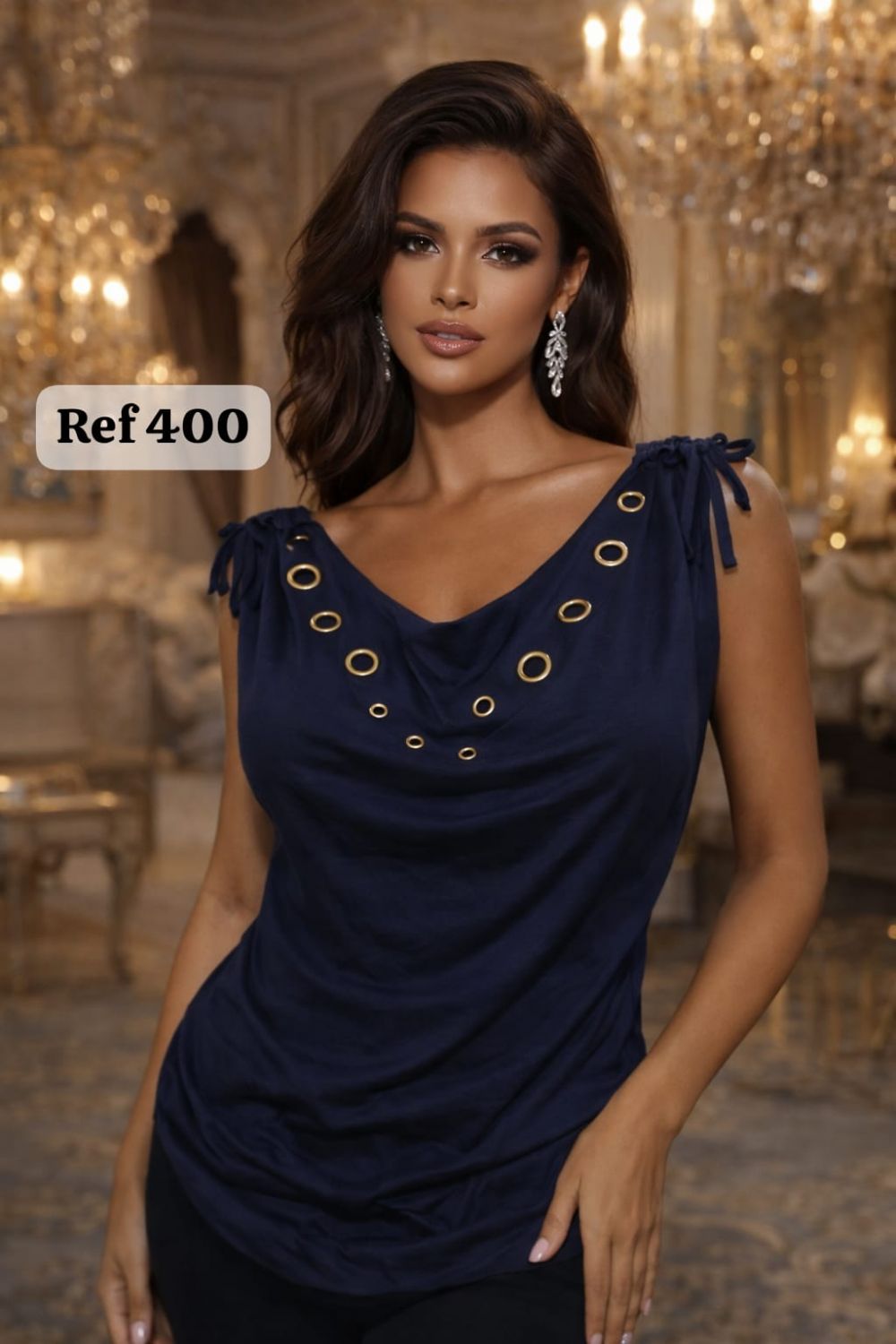 Top fluido con escote drapeado y detalles metálicos – Ref. 400