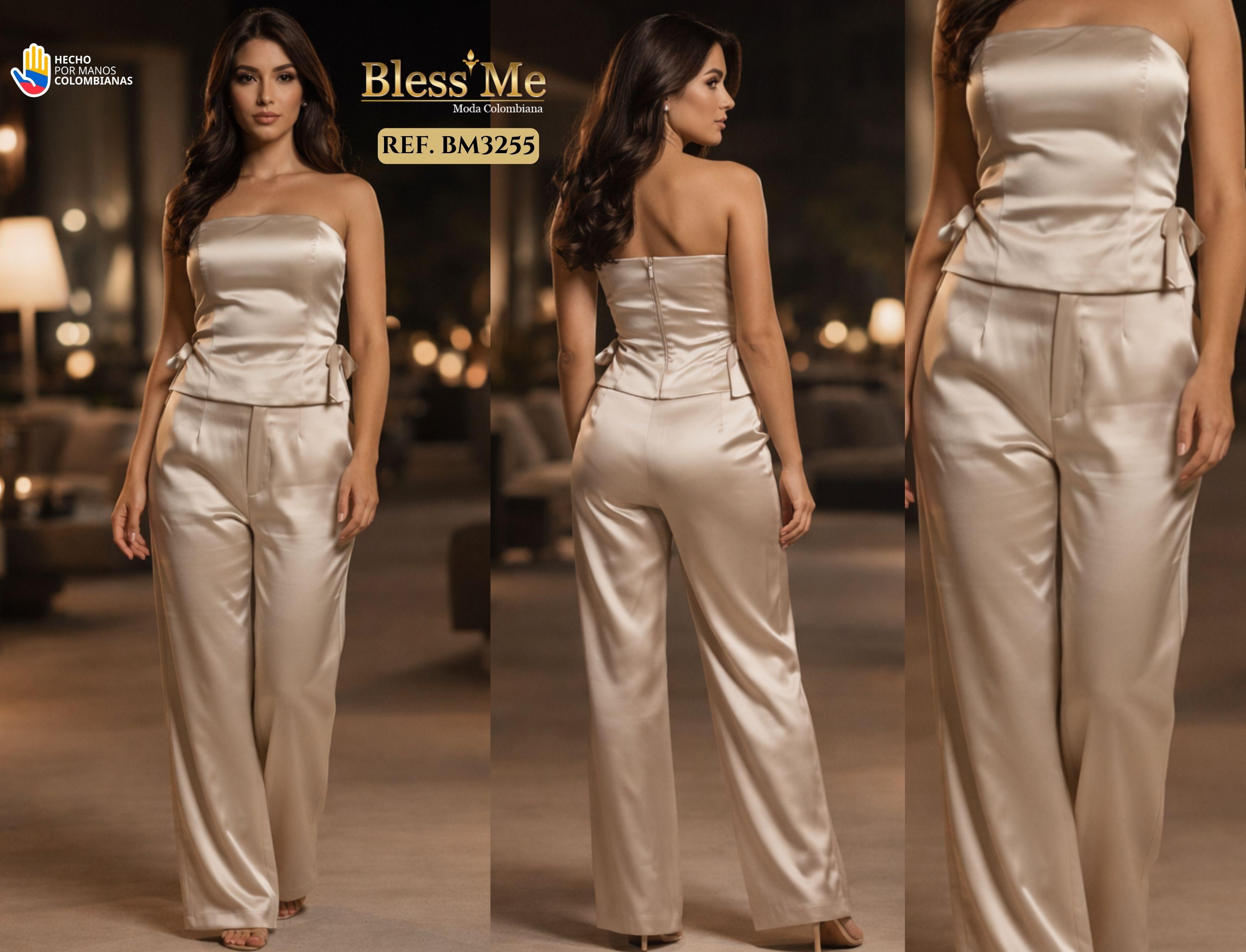 CONJUNTO LARGO BLESS ME REF BM3255 El conjunto Ref. BM3255 de Bless Me combina distinción y feminidad en una propuesta sofisticada de moda colombiana. Elaborado en satín de brillo sutil, este diseño de dos piezas realza la figura con un acabado fluido y elegante. El top tipo corset sin tirantes se ajusta con cremallera posterior y delicados lazos laterales que acentúan la cintura, mientras que el pantalón de corte recto aporta caída natural y movimiento refinado. Ideal para eventos, cenas o celebraciones en las que se busca un estilo moderno con un toque de glamour clásico. Características destacadas: